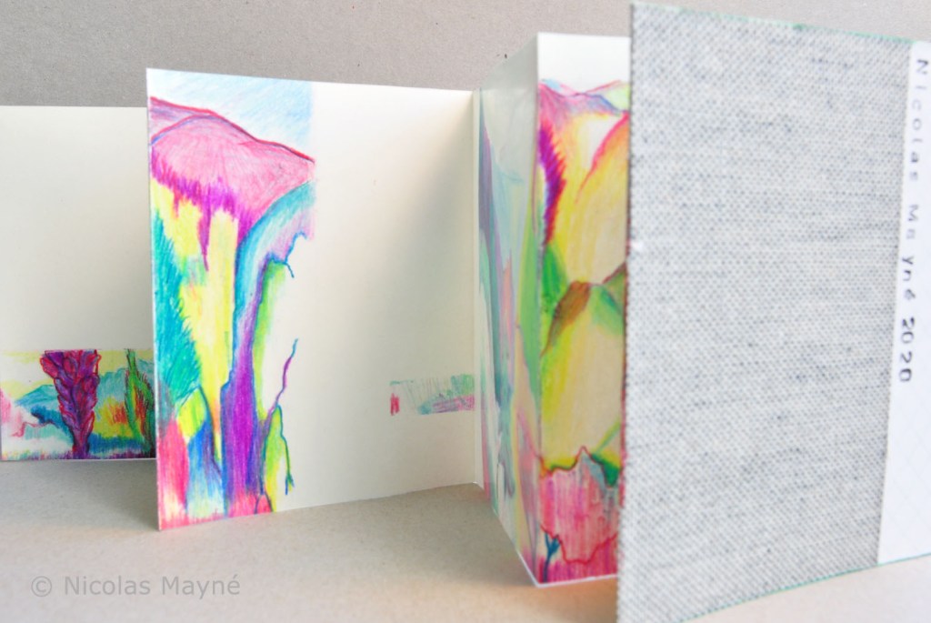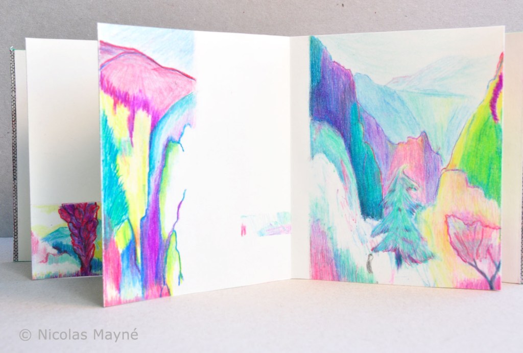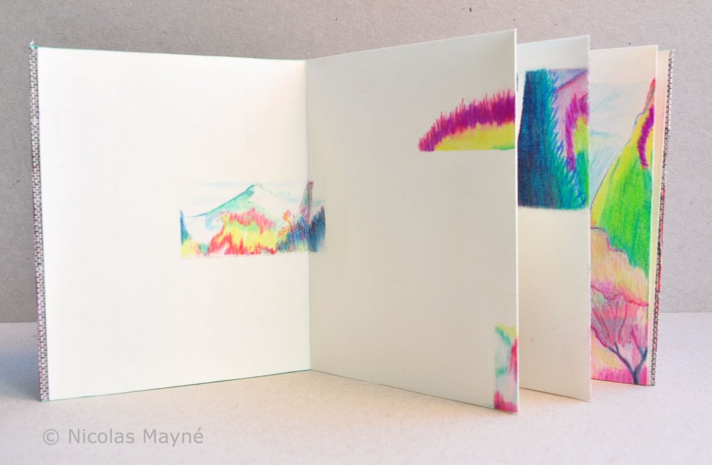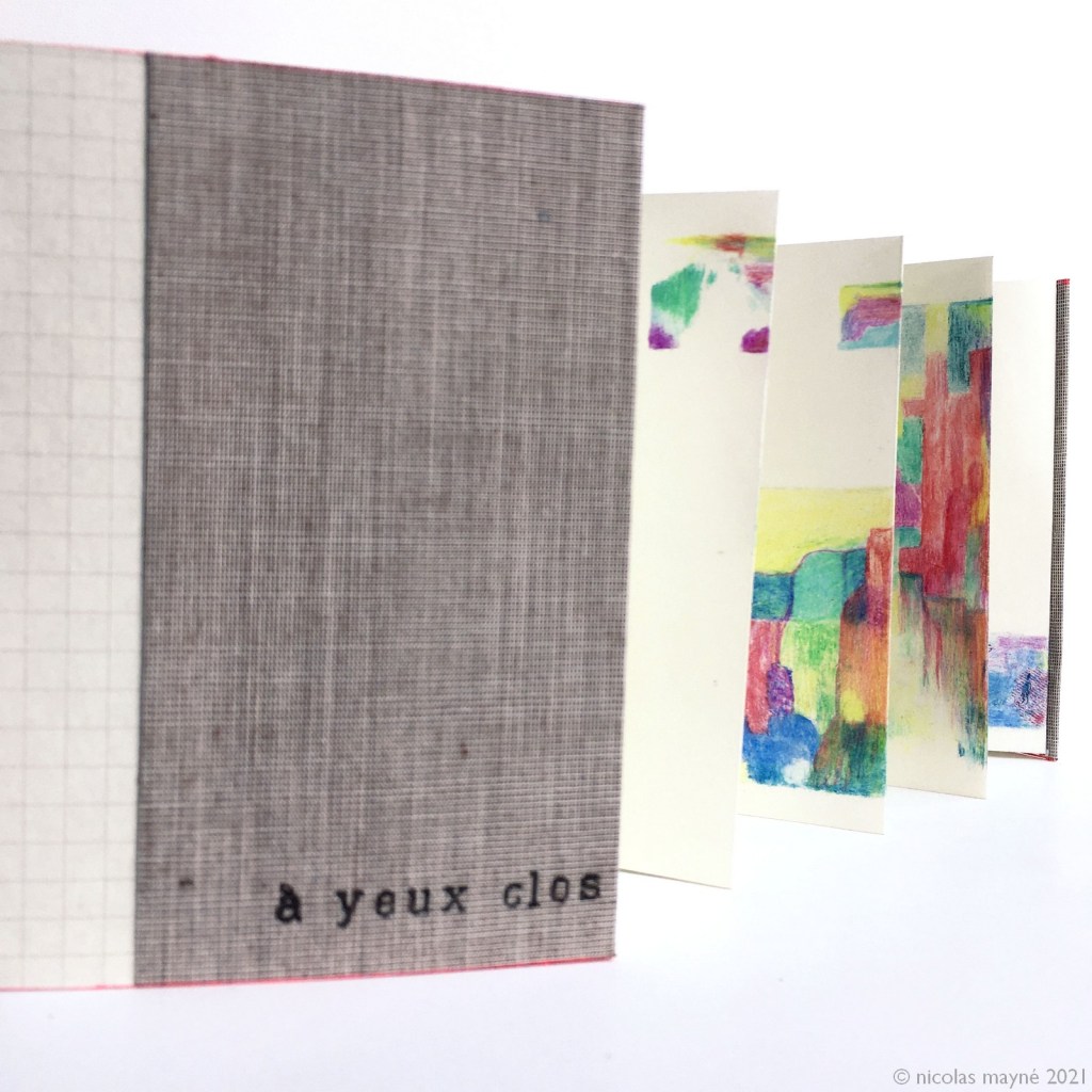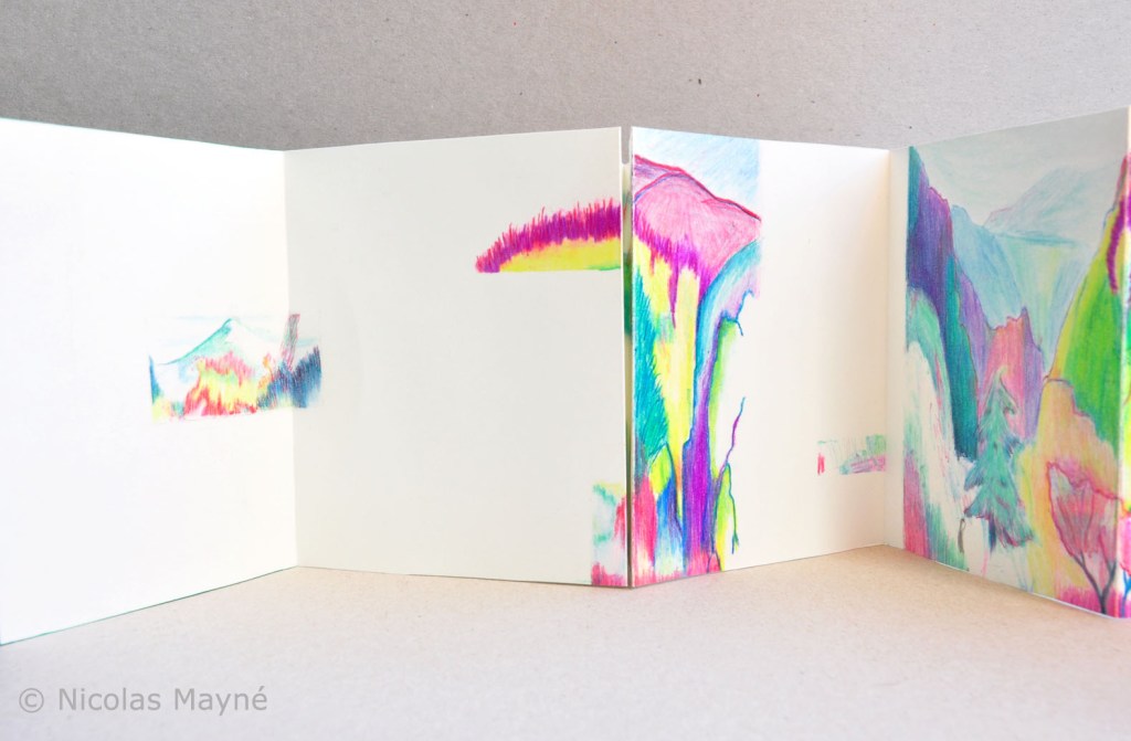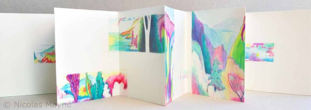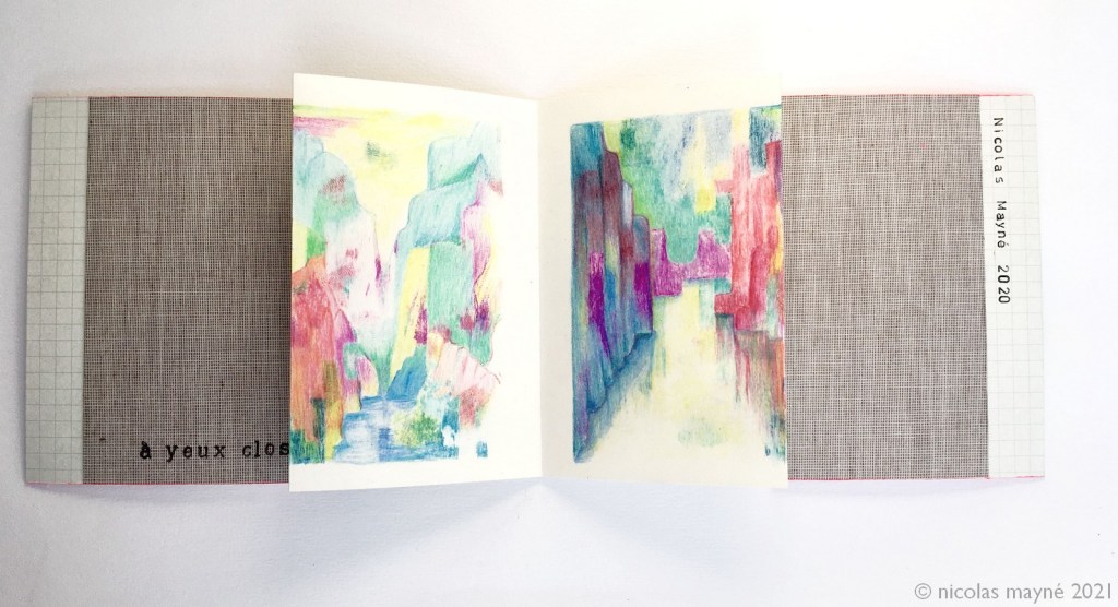 Prenant pour thème le paysage, « à yeux clos » est une série de petits leporellos dont les dessins ont été réalisés, dans un premier temps, les yeux fermés. Voici les troisième et quatrième livres, colorés cette fois-ci, de la série.