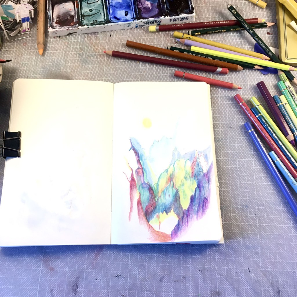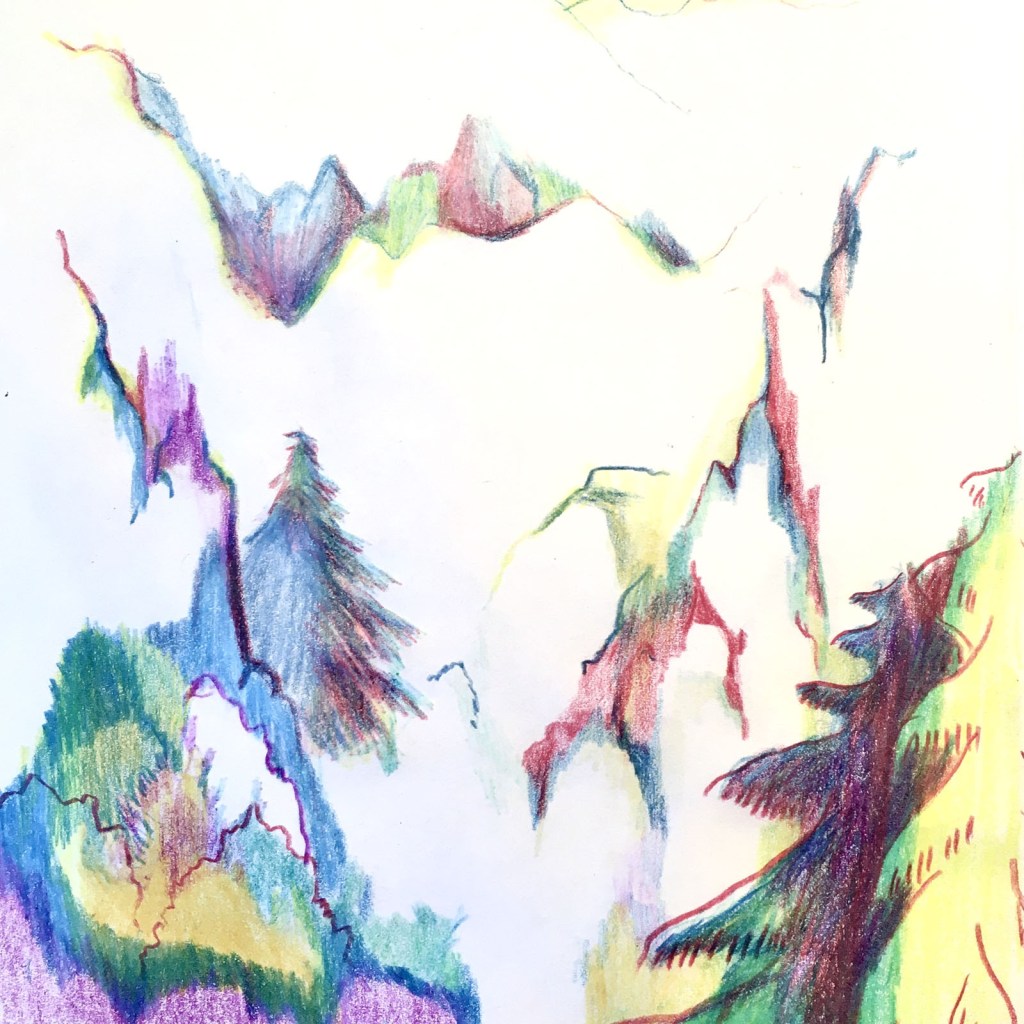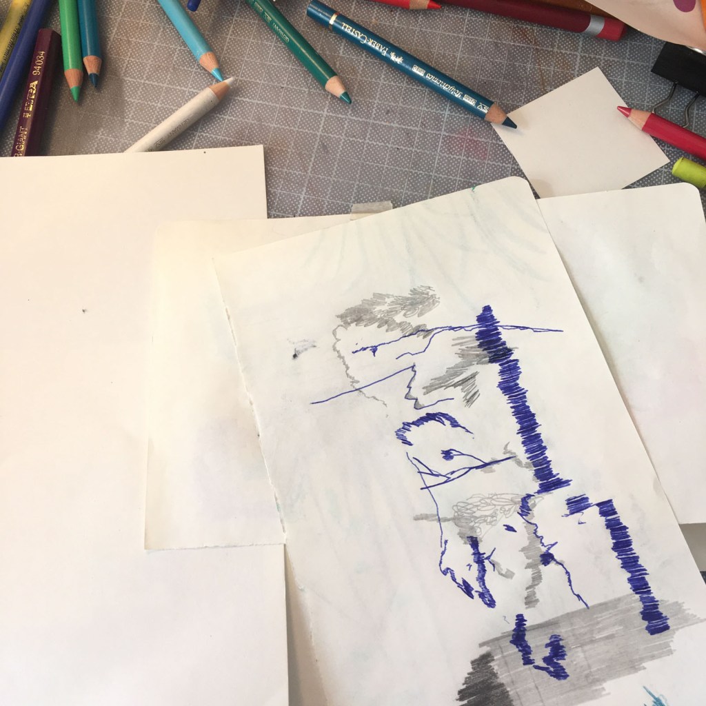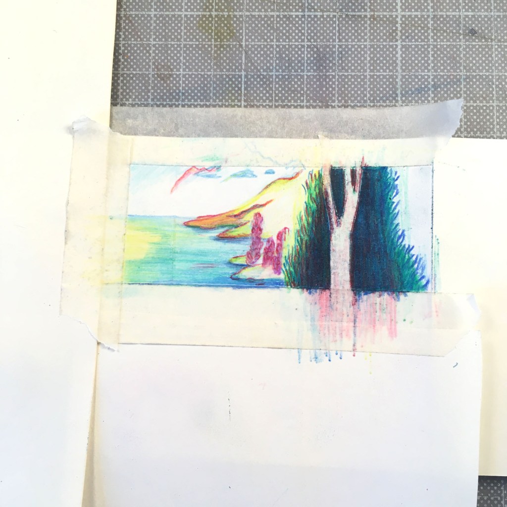 Les yeux fermés, j’ai dessiné à l’arrière de mon « papier carbone » un paysage aléatoire. Là où j’ai dessiné, le trait se transfère en couleur dans les pages du livre: