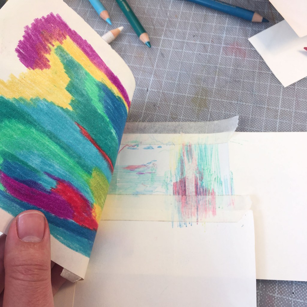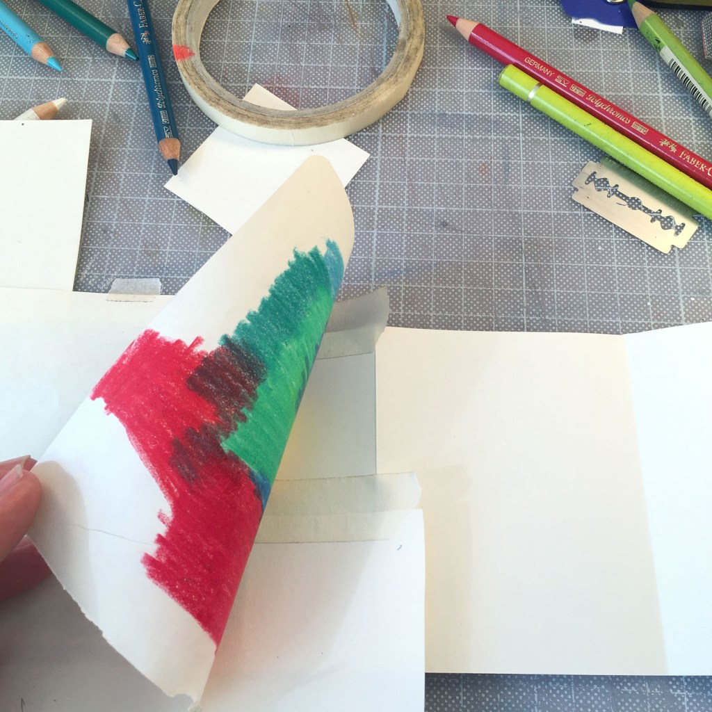 Avec des crayons de couleurs gras j’ai confectionné mon « papier carbone » maison. Je l’ai ensuite posé face coloriée contre la page vierge de mon futur petit livre: