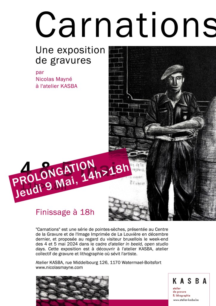 Carnations est une série de pointes-sèches, présentée au Centre de la Gravure et de l’Image Imprimée de La Louvière en décembre dernier, et proposée au regard du visiteur bruxellois le week-end des 4 et 5 mai 2024 dans le cadre d’atelier in beeld, open studio days.