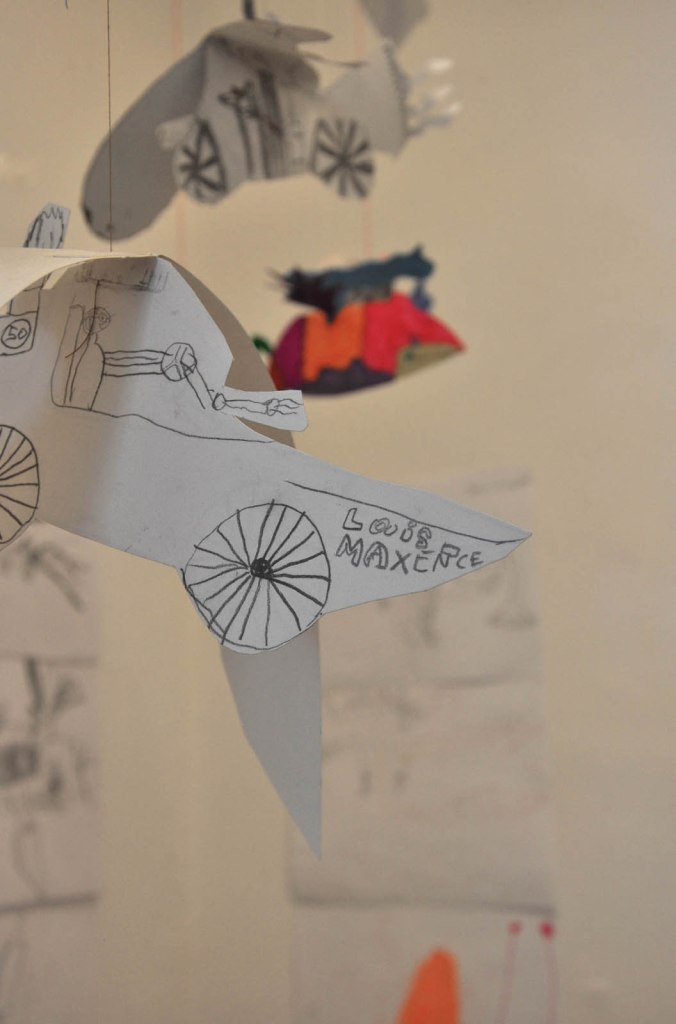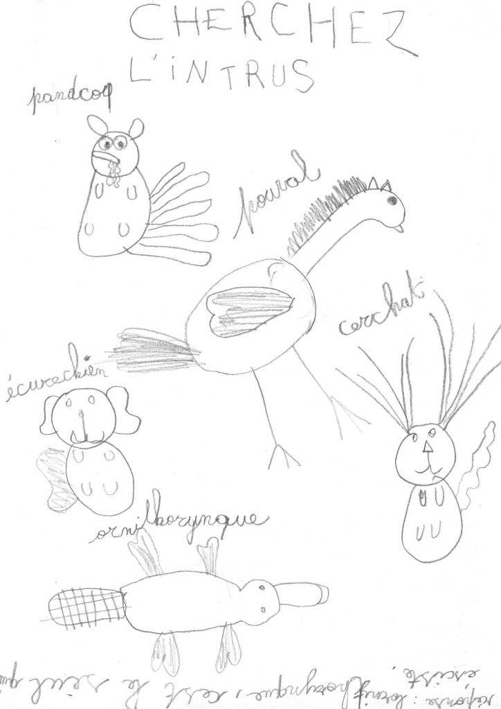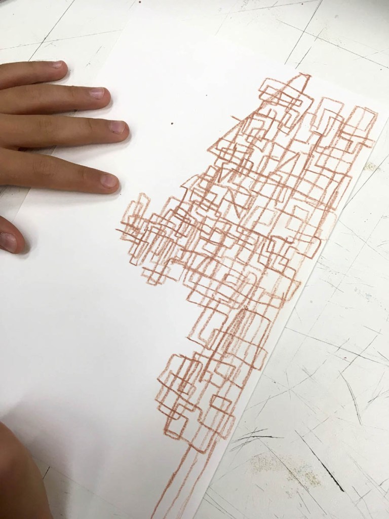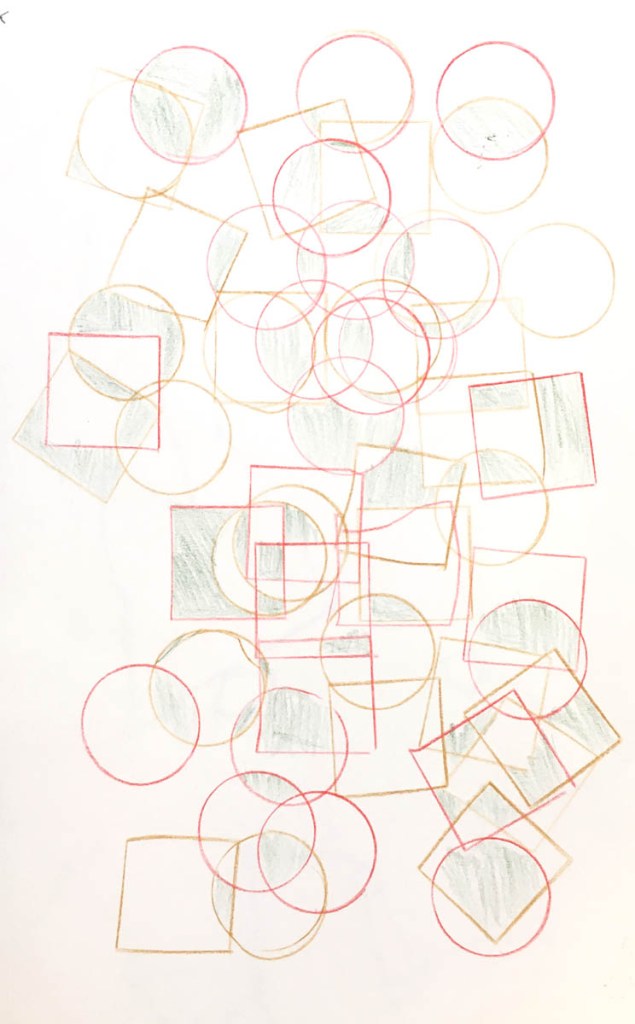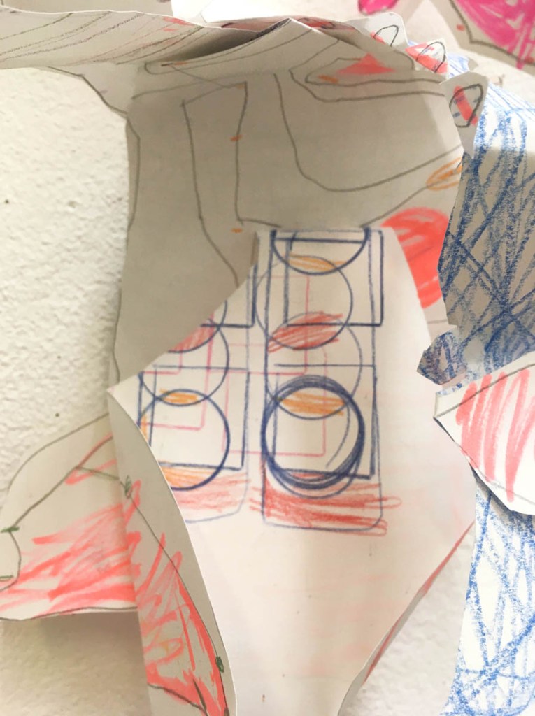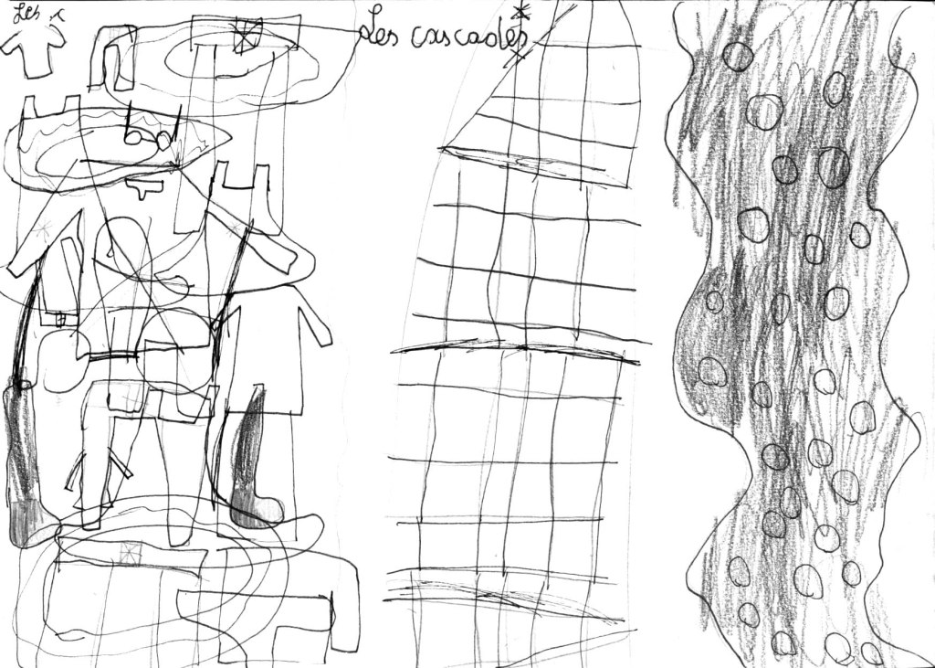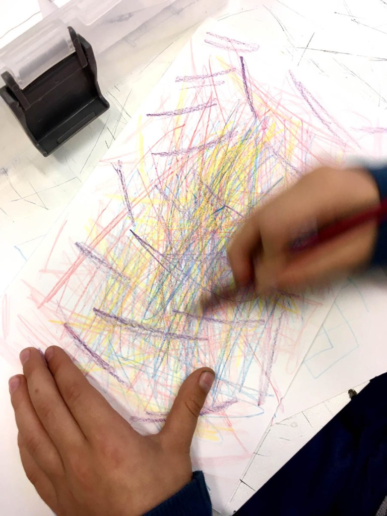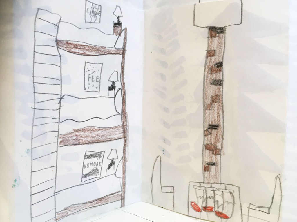 Avec des tracettes de fortune*, j’ai demandé aux enfants, à l’arrière de la deuxième feuille, de tracer des formes, ou des bouts de formes, en les superposant.