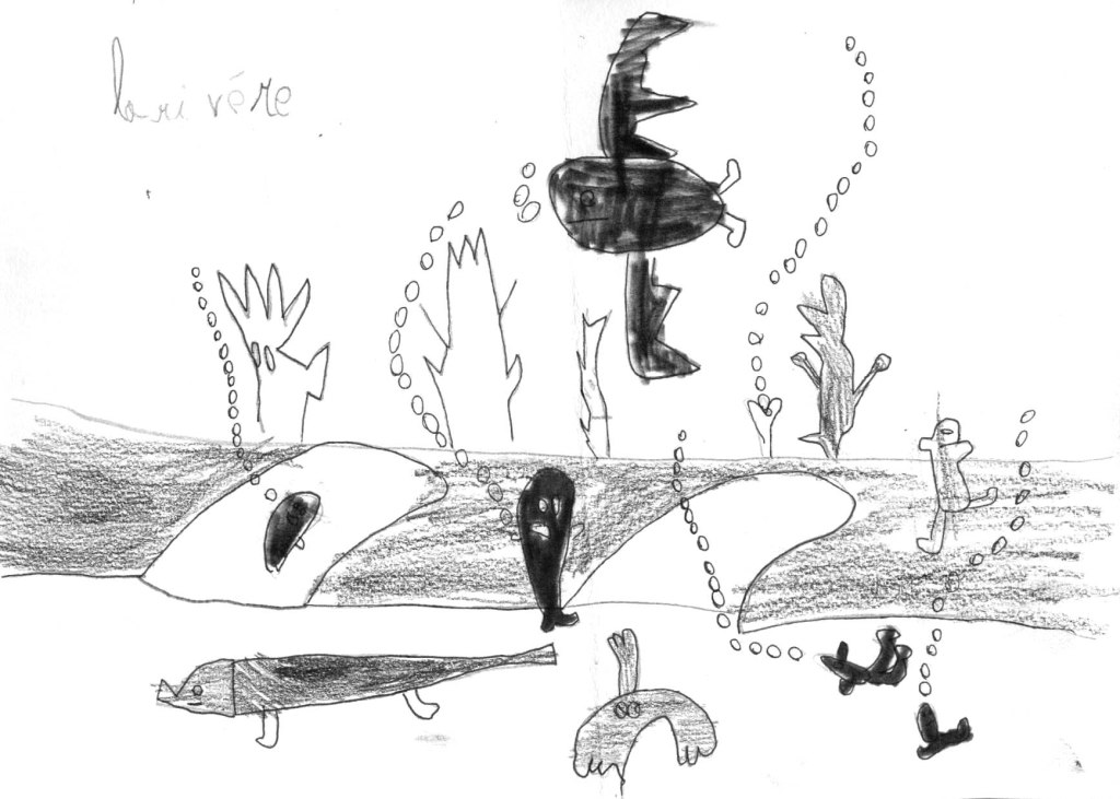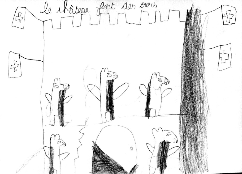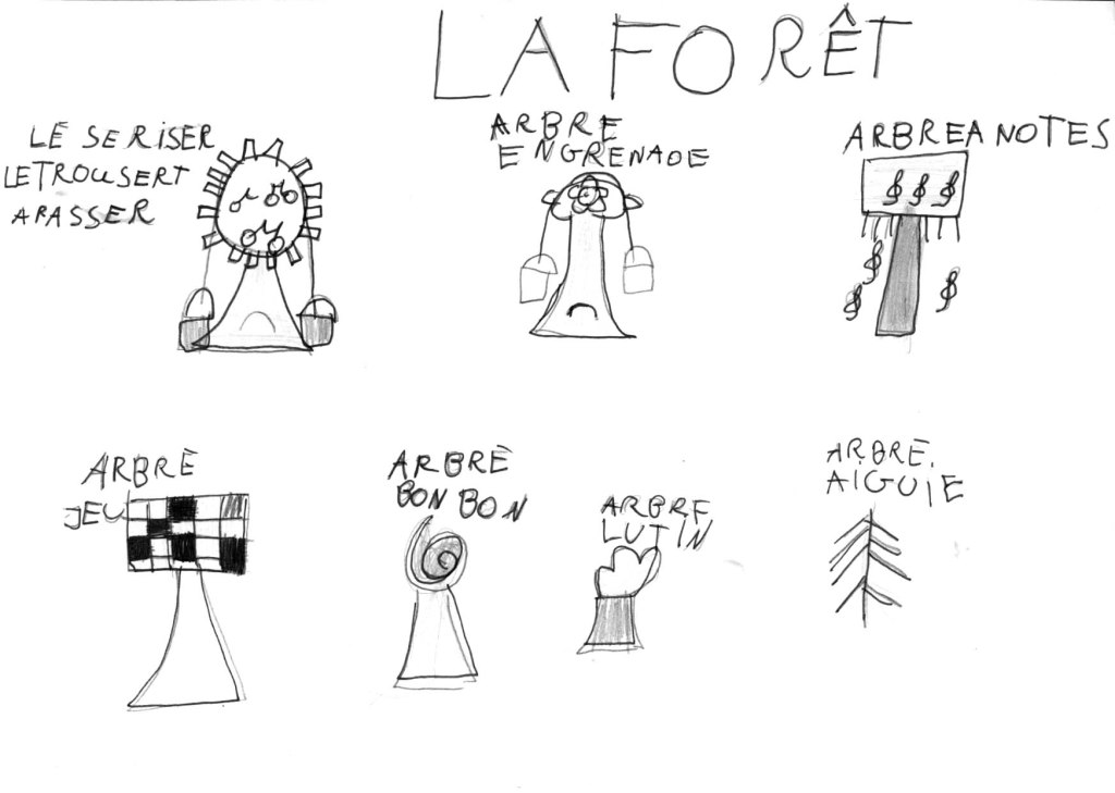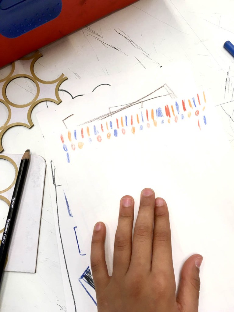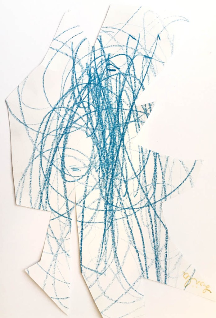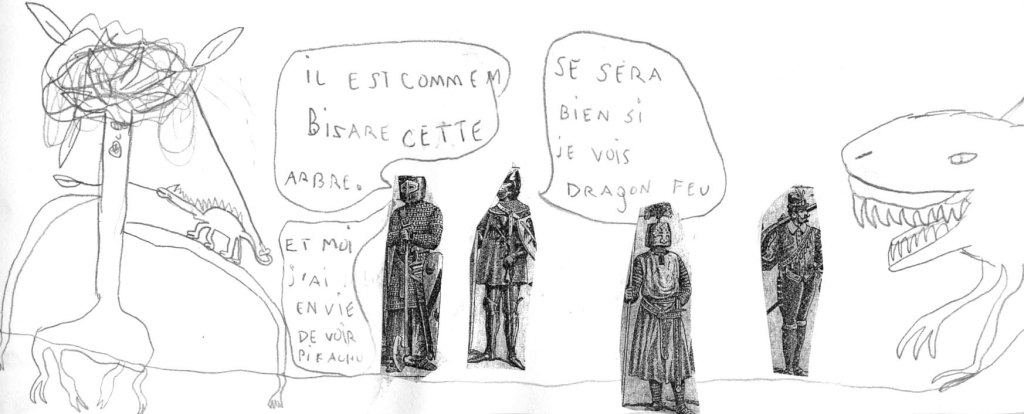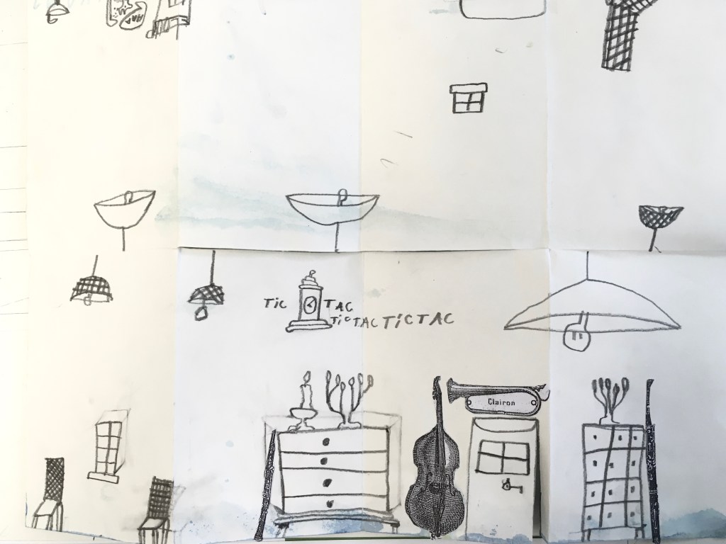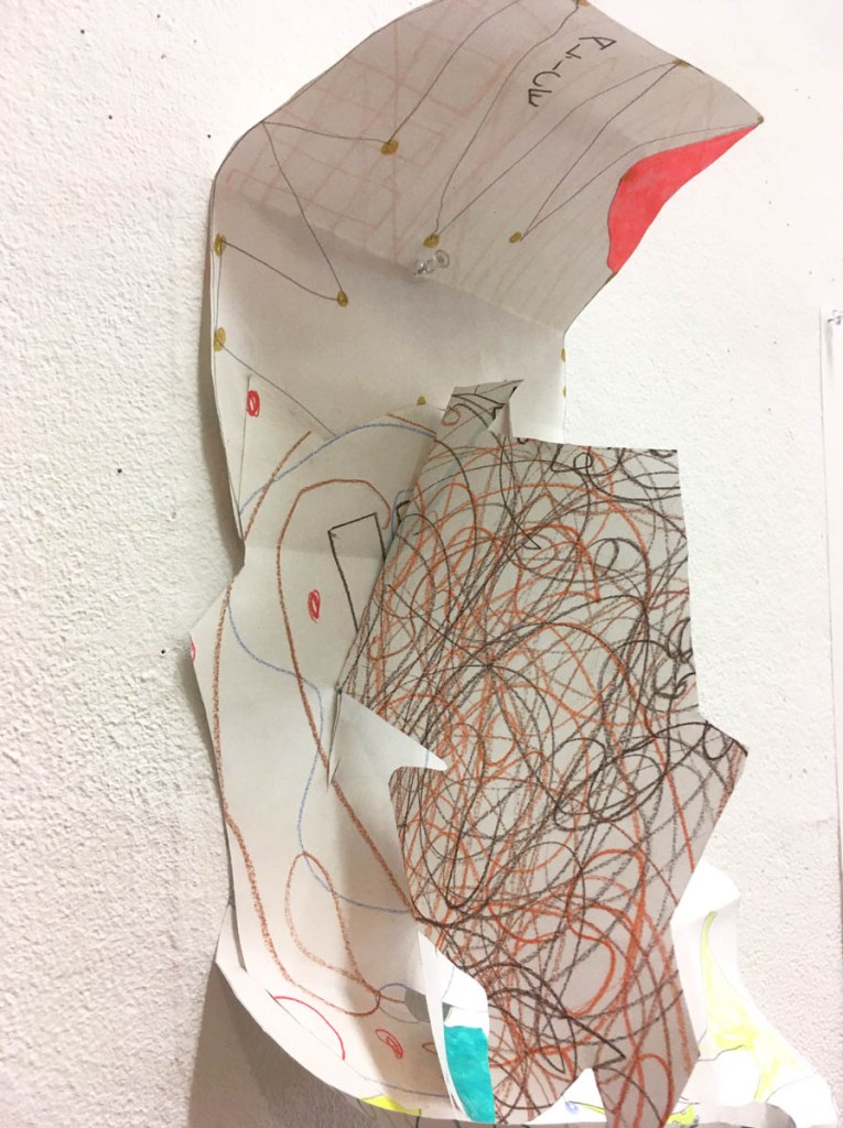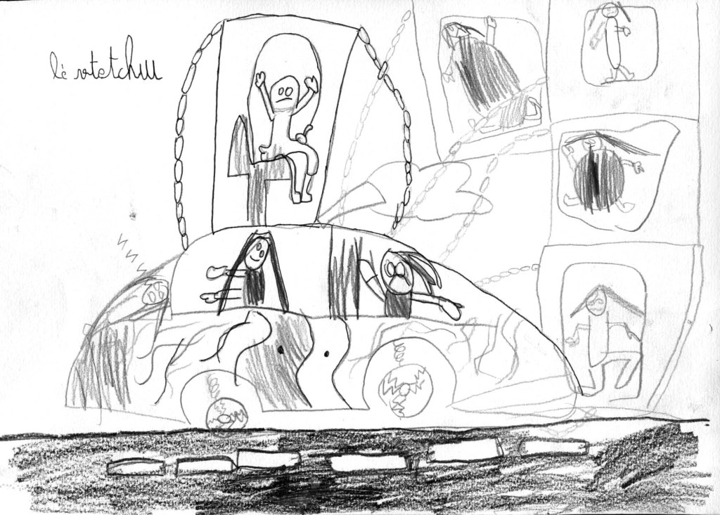 Avec des tracettes de fortune*, j’ai demandé aux enfants, à l’arrière de la deuxième feuille, de tracer des formes, ou des bouts de formes, en les superposant.