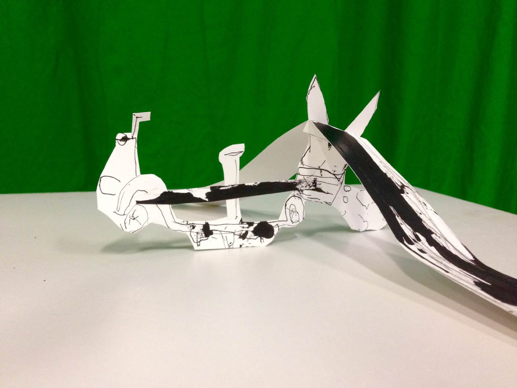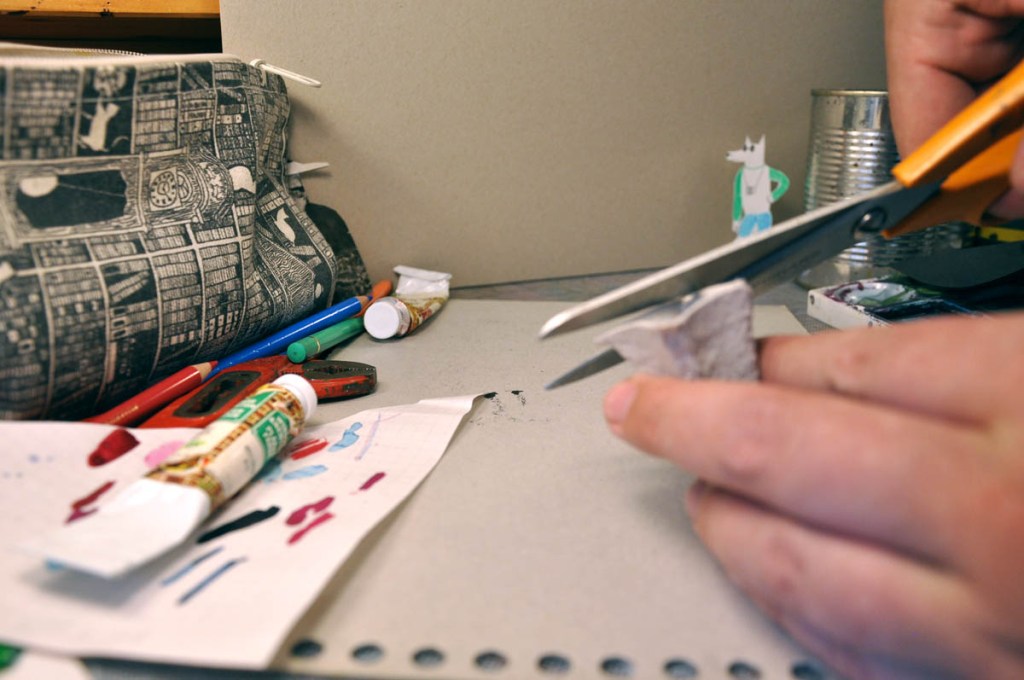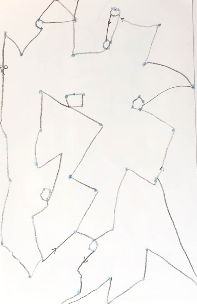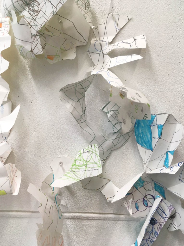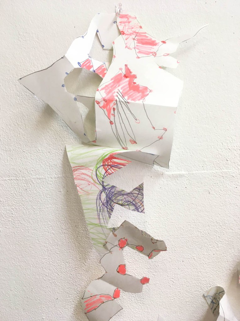 Pour l’étape suivante, on a tout d’abord repris le recto des feuilles (le côté avec les points et les lignes). En découpant les lignes les plus proches des bords, les enfants ont dû créer des formes abstraites.