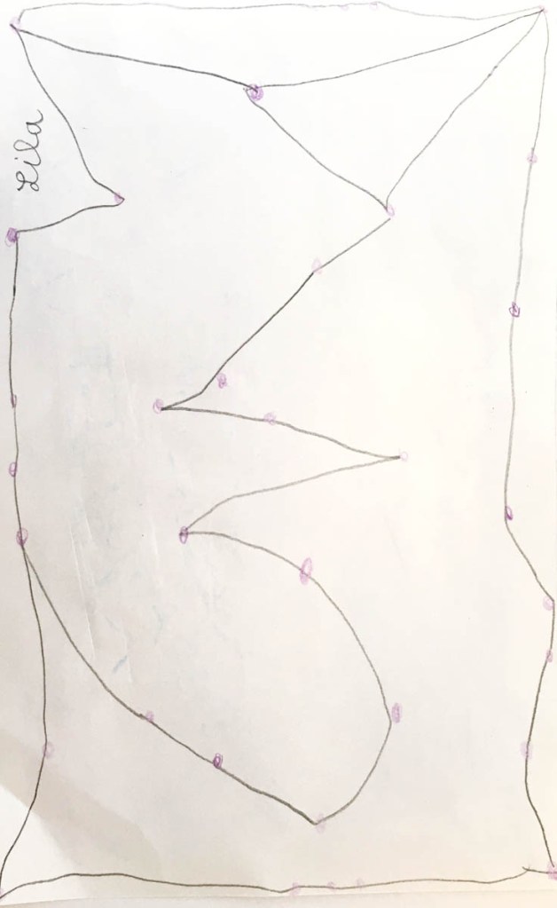 En les comptant ensemble au fur et à mesure, je leur ai demandé de dessiner sur ces feuilles une série de points (en essayant de les répartir une peu partout sur la feuilles, bords y compris)