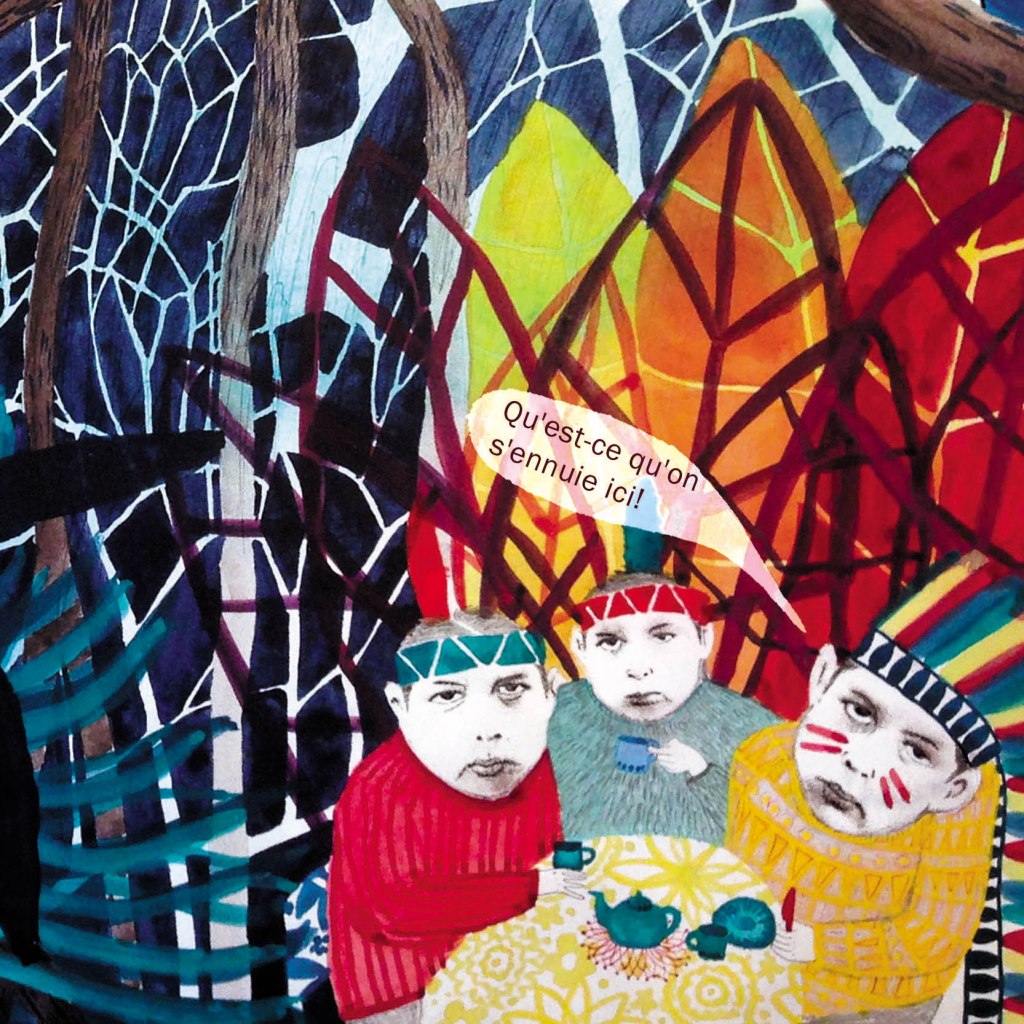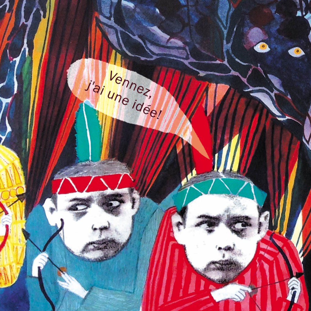 En effet, l’image devait créer une interaction avec le lecteur, et après maintes cogitations, ce sont deux indiens, échappés pour l’occasion de mon livre TÔA MOÄ (éditions Esperluète), qui me sont venus en aide!