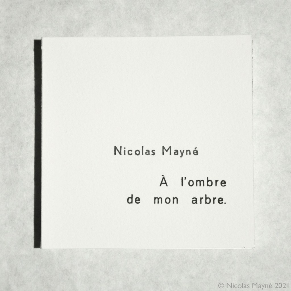 Ce petit livre est né d’un thème imposé pour une exposition collective, l’arbre. J’ai eu beaucoup de mal à trouver l’idée (car comment parler d’arbre sans tomber dans les images déjà vues et revues). Pour finir j’ai décidé de parler d’un arbre sans le montrer, d’évoquer plutôt ce qui se passait dans son ombre.