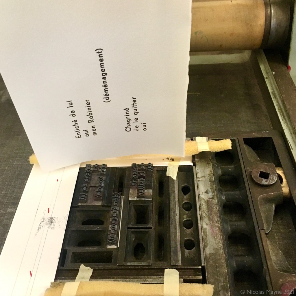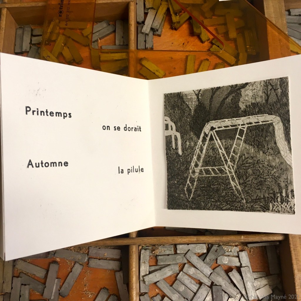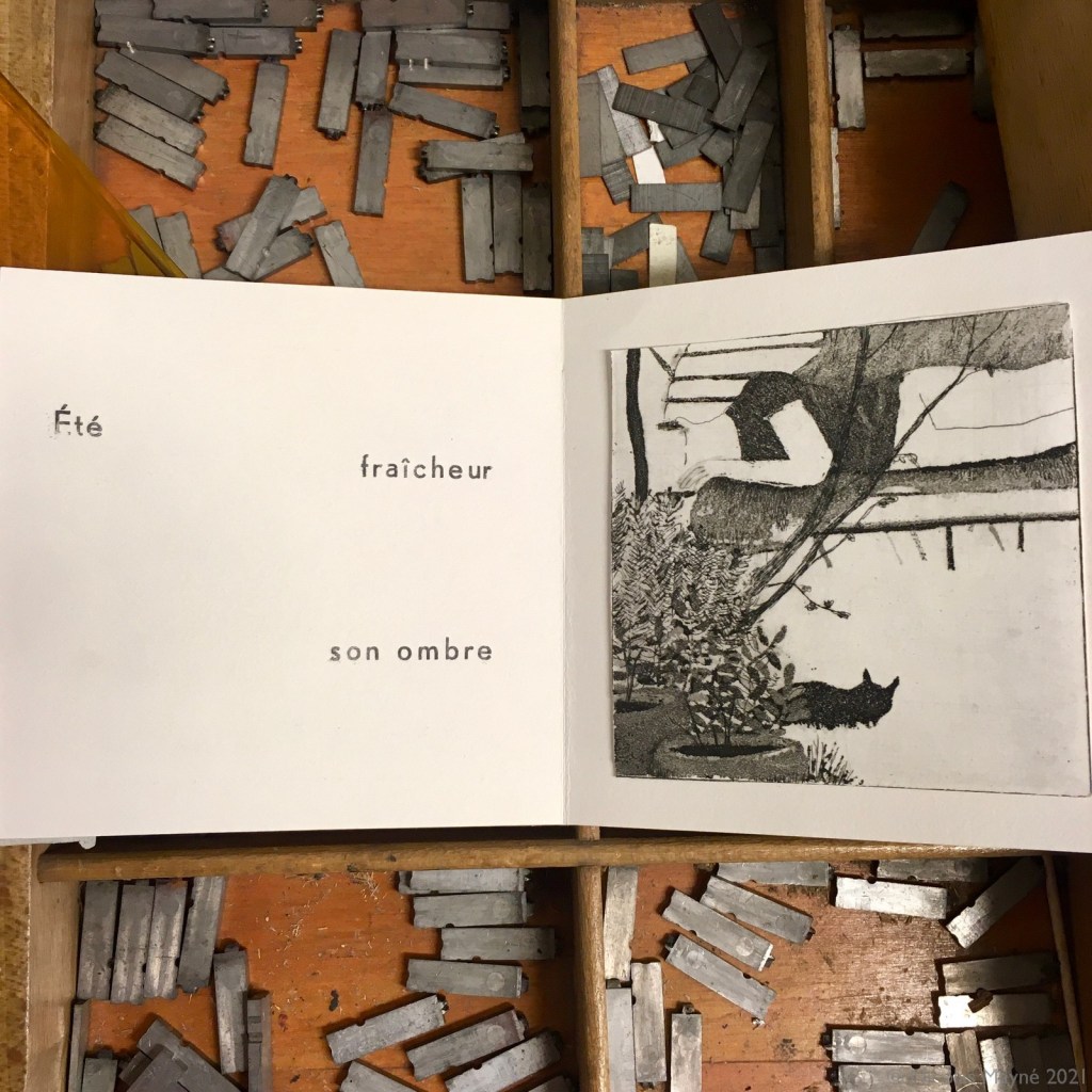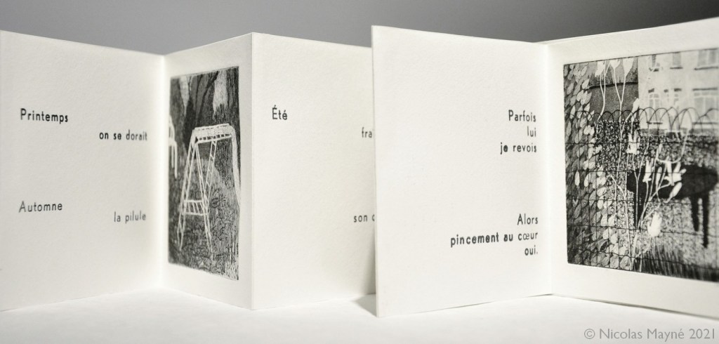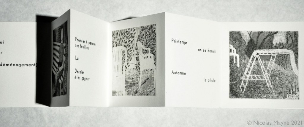 À l’ombre de mon arbre est un leporello (livre accordéon) mêlant gravure (aquatinte et eau-forte pour les images) et typographie (pour les textes).