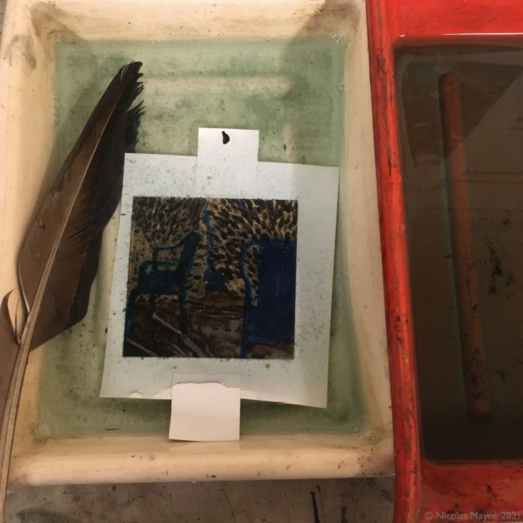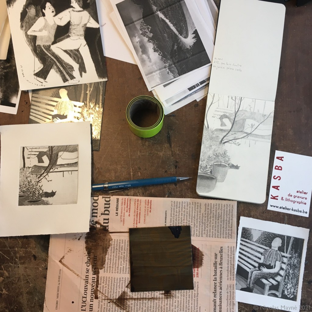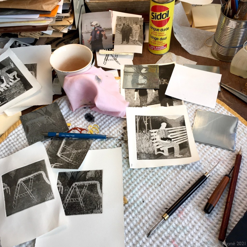 Ensuite, la gravure! Les techniques utilisées sont principalement l’aquatinte et l’eau-forte sur zinc. Pour certaines plaques j’ai aussi utilisé la gravure au sucre avec aquatinte.