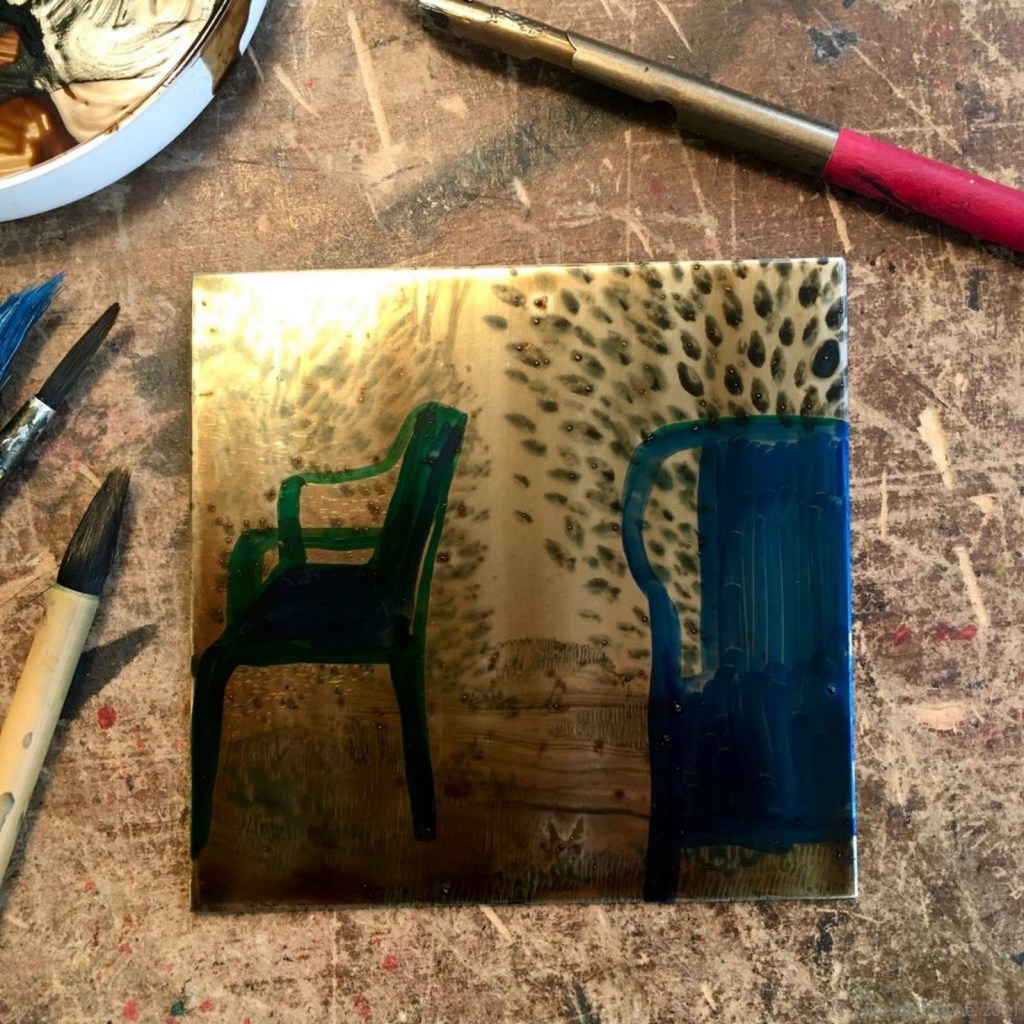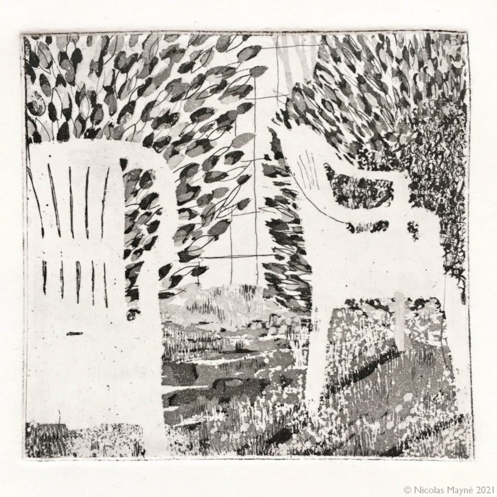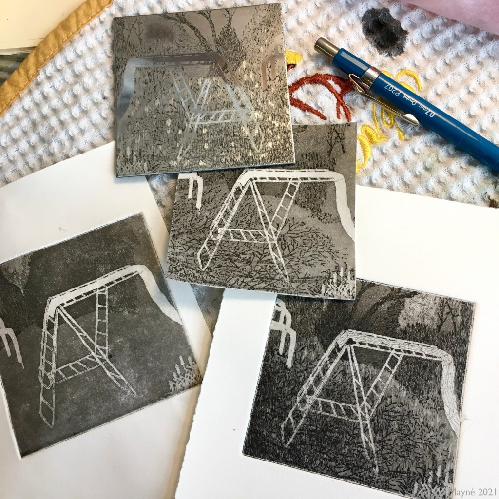 Ensuite, la gravure! Les techniques utilisées sont principalement l’aquatinte et l’eau-forte sur zinc. Pour certaines plaques j’ai aussi utilisé la gravure au sucre avec aquatinte.