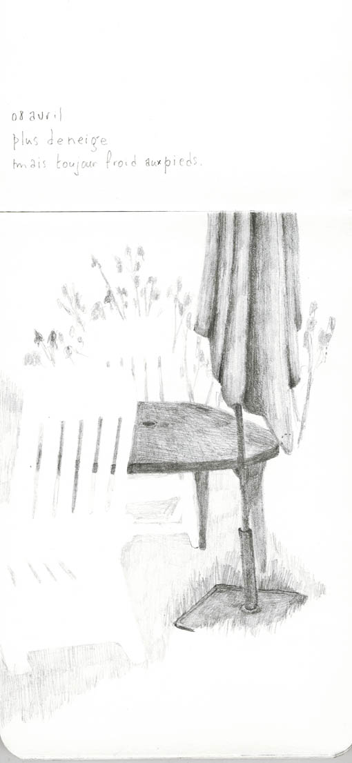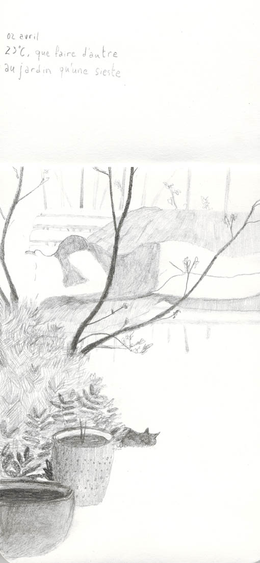 Quant aux images elles sont inspirées, paradoxalement, et plus ou moins directement, de croquis faits, quelques temps avant, dans mon jardin actuel (où il n’y a plus d’arbre et plus beaucoup d’ombre).