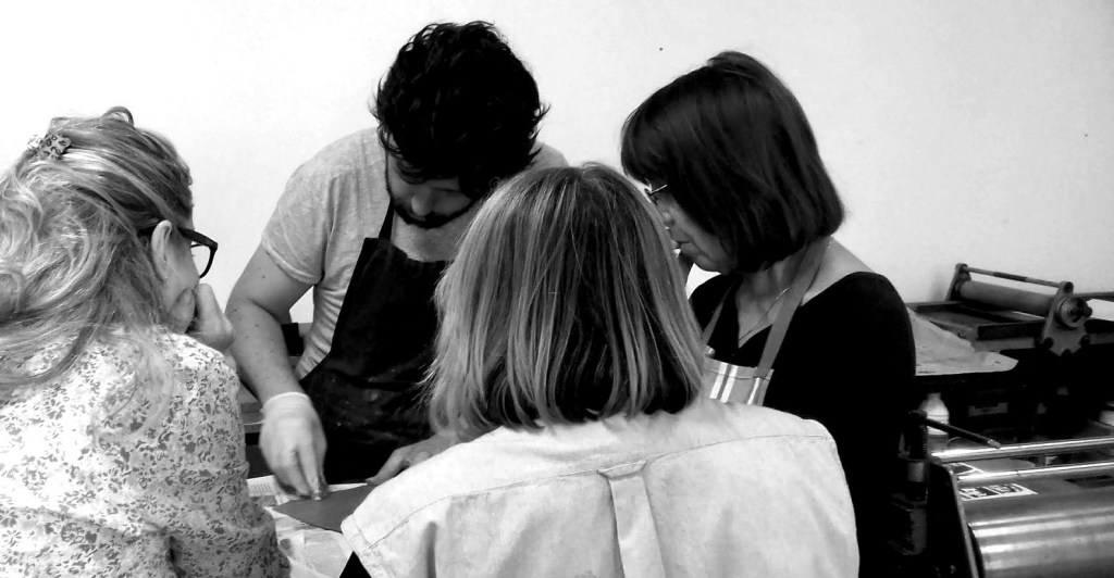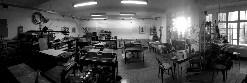 « Ici il y a le coin des lithographes, une presse et un mur de pierres calcaires bien rangées. Là, le coin des typographes où sont classés les milliers de lettres de plomb dans une vingtaine de « casses ». Au centre de la pièce aux grandes fenêtres trône une presse qui sert à l’impression des cuivres et des bois. Comme en musique, l’atelier c’est tout un orchestre en marche, ici se côtoient et s’activent le taille-douce, l’aquafortiste, le lithographe, le buriniste et le xylographe.