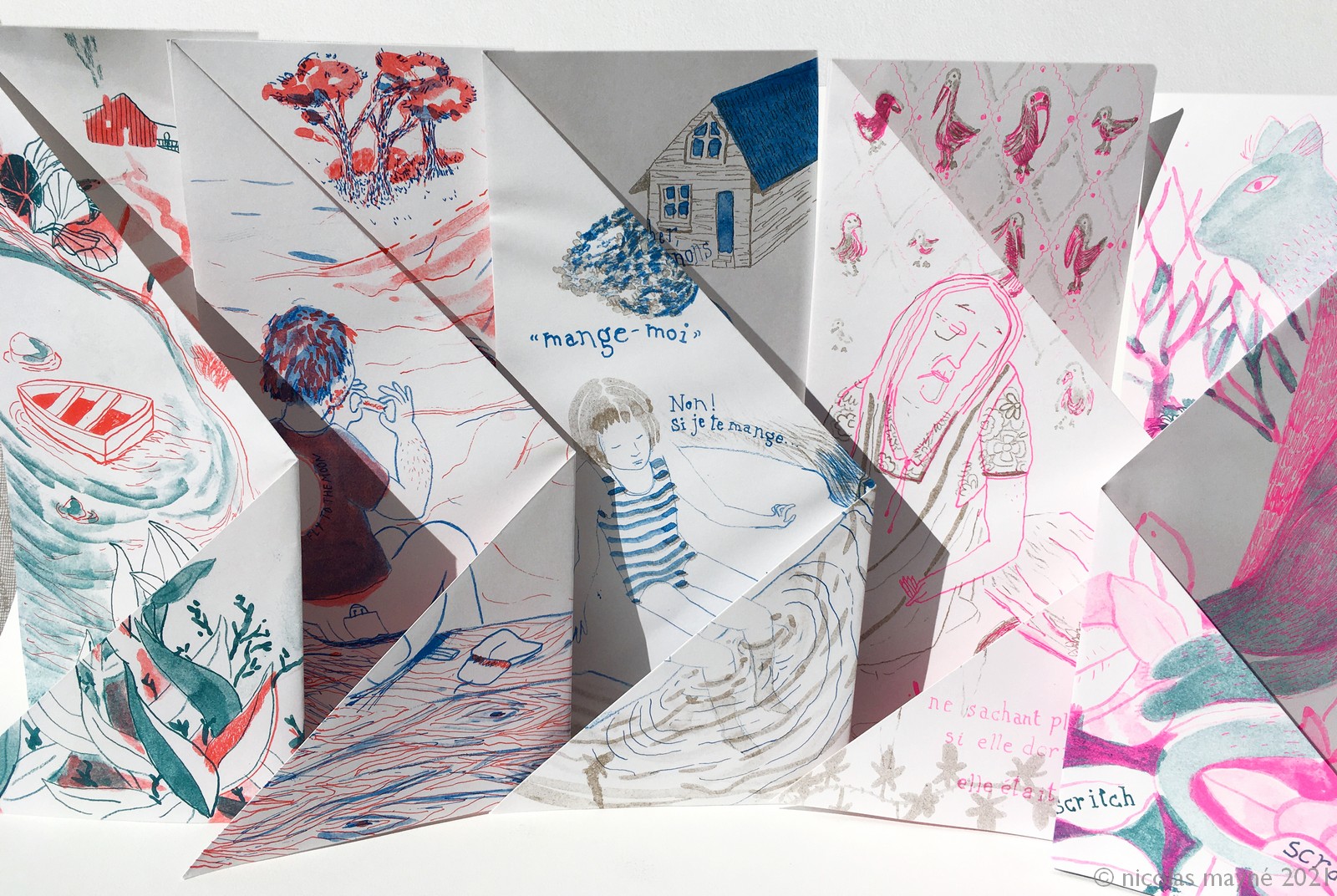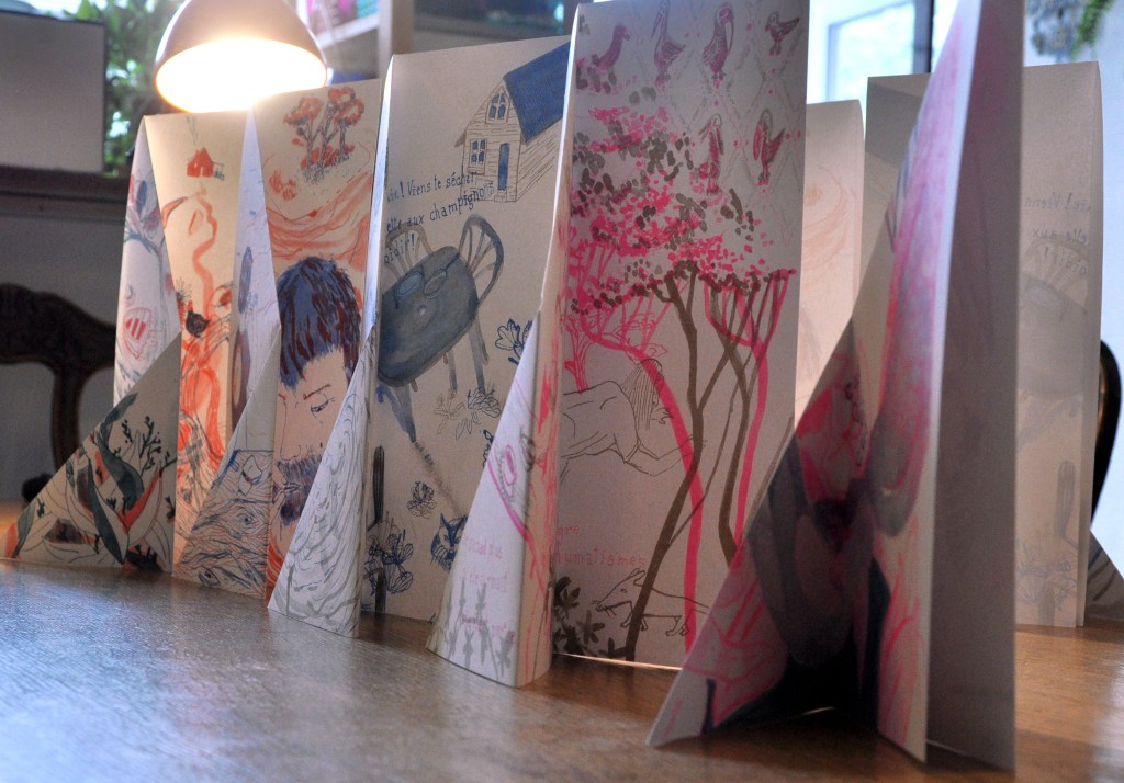 Le point de départ était de trouver un pli permettant, à partir d’une simple feuille A3 imprimée, d’avoir plusieurs lectures d’une image, en amorçant une narration, et en créant une sorte de petit livre sans reliure. Après maintes recherches, Raphaëlle a trouvé le pli qu’il nous fallait.