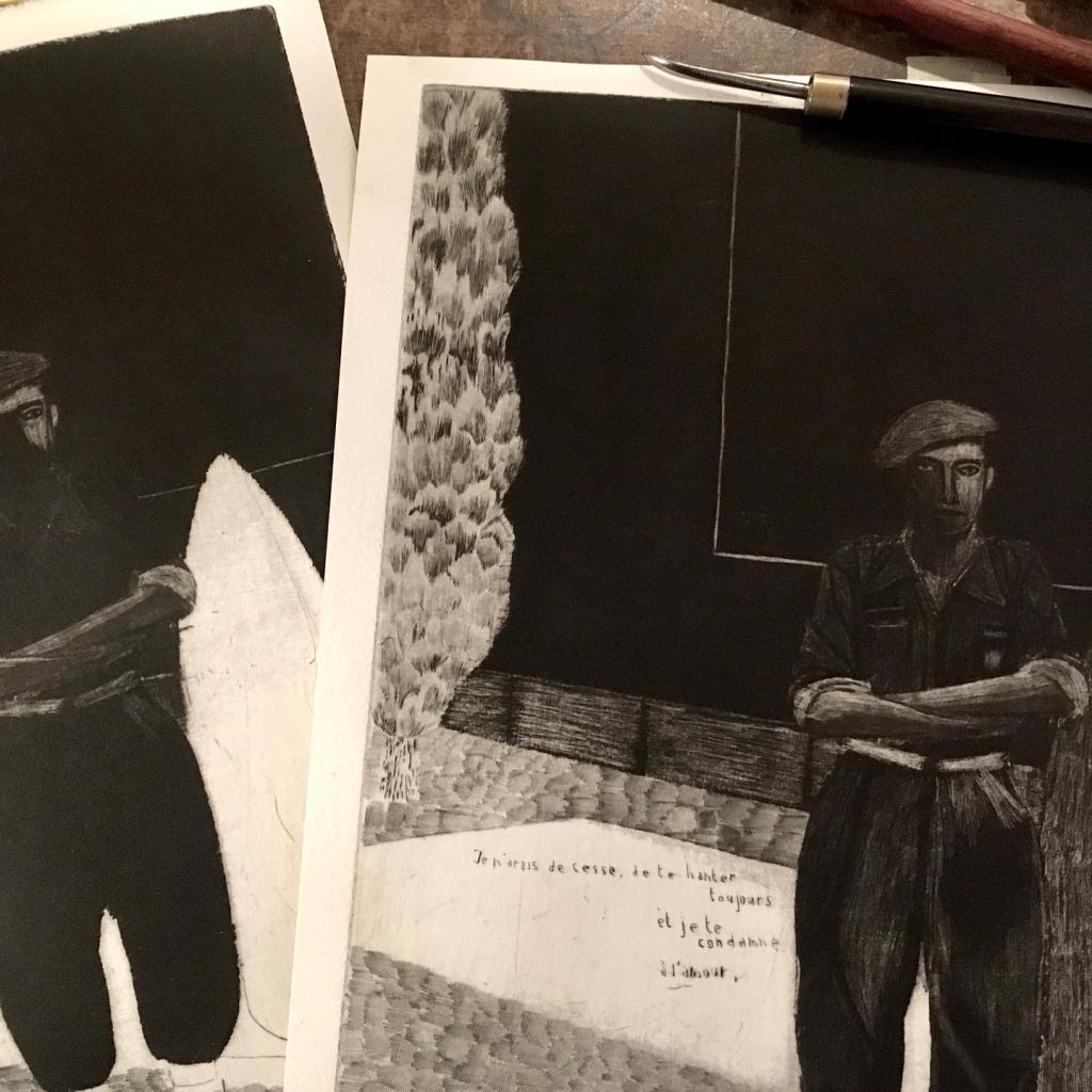 Pour cette exposition, ce n’est pas moins de 7 nouvelles gravures qui on été créées (ça peut ne pas paraître beaucoup, mais ceux qui connaissent ma façon excessivement lente de travailler savent ce que ça veut dire) dont 4 en grand format!!! (des plaques 20×25 cm imprimées sur un papier de 50×70 cm, ce qui non plus peut ne pas paraître beaucoup, mais ceux qui connaissent mon travail savent à quel point je suis sorti de ma zone de confort).